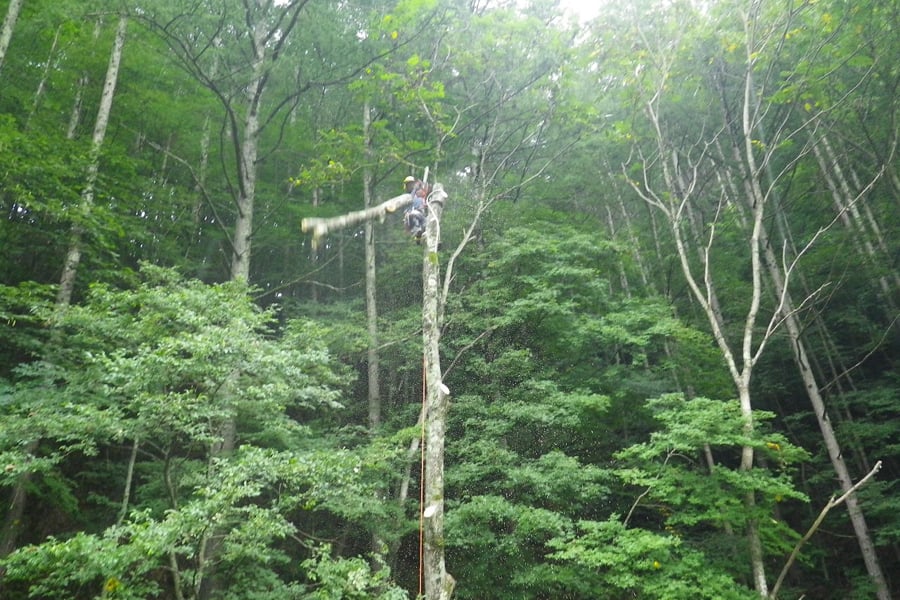 敷地の狭いところでも、このウッドタワー工法を使えば、安全に効率よく安価に立ち木を伐採できます。