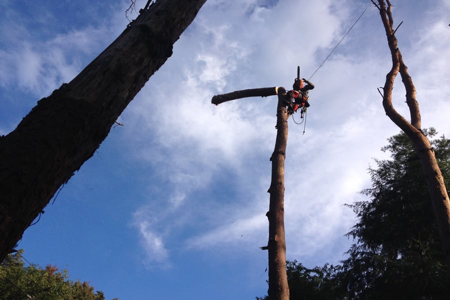 そこで、立ち木(ウッド)をタワークレーンのように使い、そこに伐採木を吊しながら処理していきます。